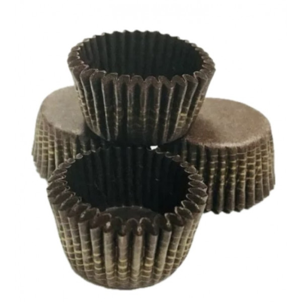 Questo pirottino tondo di colore marrone e decorazioni dorate è un contenitore ricavato da un foglio di carta da forno, per alimenti, con il bordo a fisarmonica usato in pasticceria come supporto di piccoli dolci.